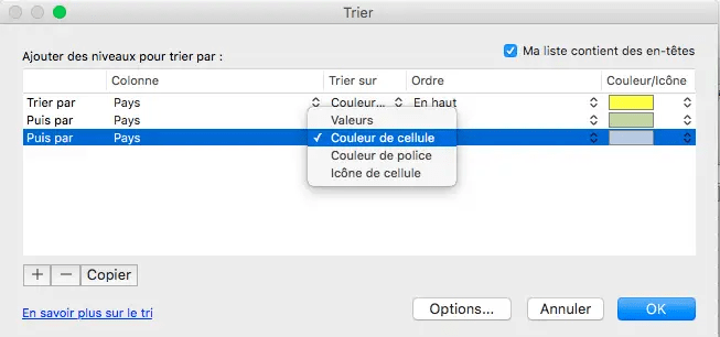 - Ajoutez une règle successive de tri pour chaque couleur présente. Vous pouvez choisir pour chaque règle quel critère utiliser, il faut bien sur sélectionner la couleur.