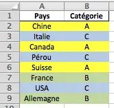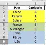 - Stocker de manière explicite le critère de la mise en forme conditionnelle dans une cellule, puis faire le tri sur ce critère. Dans l’exemple précédent, si les couleurs étaient appliquées par MFC selon la catégorie, il aurait suffit de trier selon les catégories A,B et C. Mécaniquement les données se seraient retrouvées triées également par couleur.