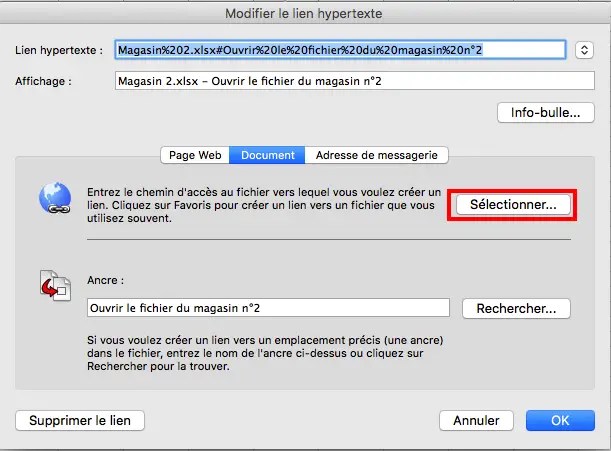 Pour créer un lien vers un fichier, vous devez également vous rendre dans le menu Insertion > Lien Hypertexte et sélectionner l’option Document