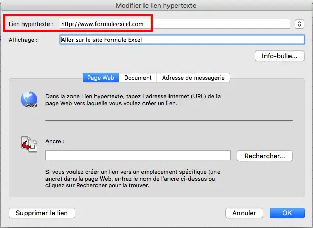 Vous devez rentrer l’adresse de la page Web dans la zone Lien hypertexte et le texte que vous souhaitez afficher dans la cellule dans la zone Affichage.